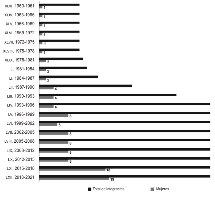 Fue hasta el 2015 cuando en la LXI Legislatura del Congreso local se contó con una presencia importante de diputadas (39 por ciento). Después, la LXII Legislatura (2018-2021) reflejó una composición de 43 por ciento de mujeres y 67 por ciento de hombres. A pesar de su creciente número, se está aún lejos de la integración paritaria.