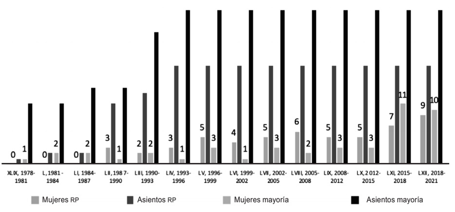 La Gráfica muestra que a pesar de que el principio de representación proporcional comenzó en la legislatura XLIX de 1978 a 1981, tuvieron que pasar nueve años en tres periodos legislativos para que se integraran mujeres bajo este principio de representación en 1987. Con el tiempo, la gráfica muestra que la presencia de mujeres en el Congreso guerrerense se hacía mayoritariamente bajo el principio de representación proporcional, la cual se hizo evidente de 1987 a 2015, limitando a las mujeres a competir en los distritos electorales bajo el principio de mayoría relativa. En las dos anteriores legislaturas, se observan más diputadas en el Congreso por la mecánica de mayoría que por la de representación proporcional.