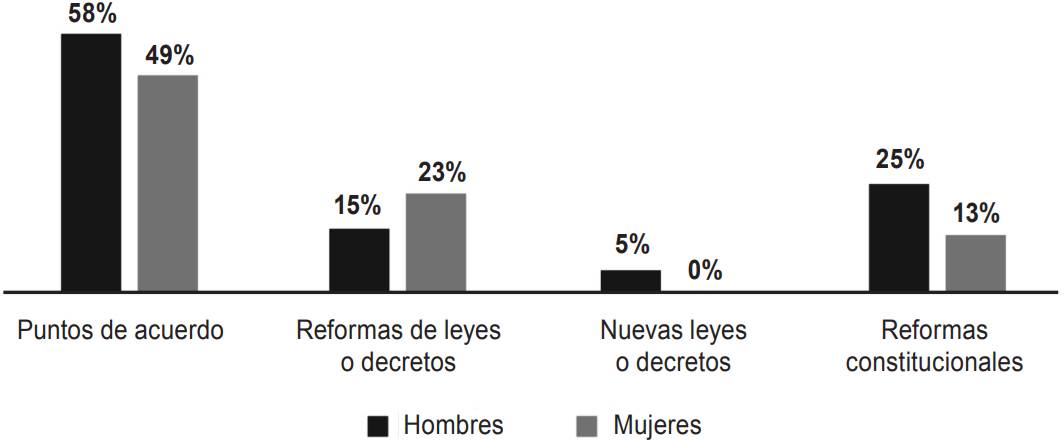 En cuanto al tipo de iniciativas que se presentan en la LXII Legislatura del Congreso, las diputadas proponen menos de la mitad de los puntos de acuerdo con relación a los hombres; en cuanto a las iniciativas de reformas a leyes o decretos, la cantidad es más nivelada entre diputados y diputadas representando el 59 por ciento y 41 por ciento, respectivamente; en lo que respecta a iniciativas para crear nuevas leyes o decretos, la cantidad vuelve a ser muy desigual entre hombres y mujeres. Durante este periodo las diputadas sólo presentaron 11 iniciativas frente a las 38 que presentaron los hombres. Por último, en lo que se refiere a iniciativas para reformar artículos de la Constitución local, las diputadas aportaron el 39 por ciento frente al 61 por ciento presentadas por hombres. Esta Gráfica evidencia que a pesar de que su integración es más o menos paritaria, en lo que respecta al trabajo parlamentario, la arena aún está dominada por los hombres.