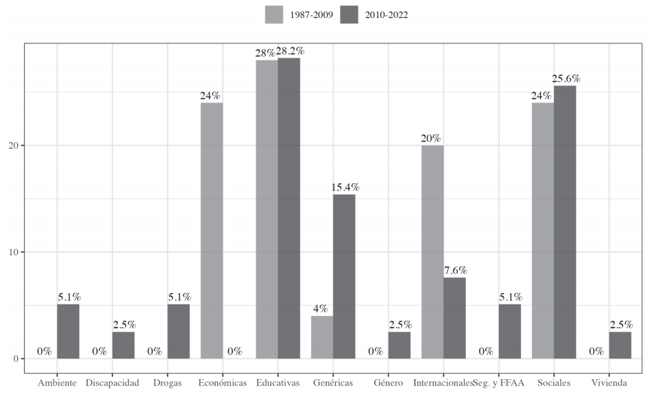 Al desglosar la categoría políticas públicas (Gráfica 1), se observa que 11 % de los artículos se centran en temas genéricos, mientras la mayoría se enfocan en políticas sectoriales. En particular, dominan las políticas educativas y sociales. Esta es una constante en el tiempo que confirma la asimetría identificada por Garcé (2005) respecto a la carencia de estudios sectoriales sobre otras arenas de política, como las económicas (9 %). En el periodo más reciente, sin embargo, se dispersa la agenda de investigación con estudios puntuales que amplían el espectro de políticas analizadas (por ejemplo, seguridad y fuerzas armadas, medio ambiente, vivienda, género, discapacidad y drogas).