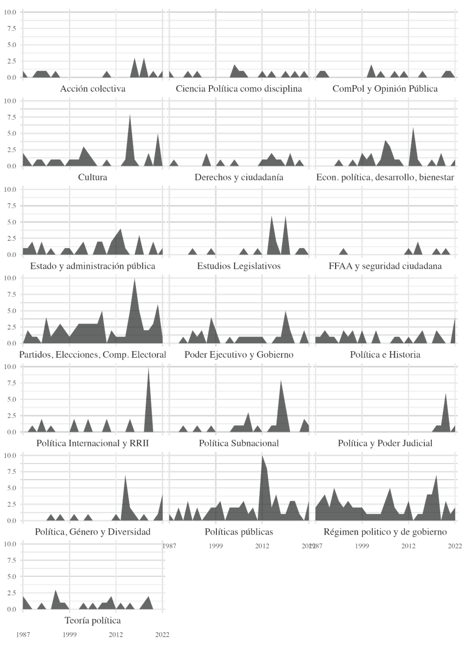 Para estudiar los temas, se revisaron los títulos y palabras clave de los artículos, y en casos ambiguos, se leyeron sus resúmenes. Para clasificarlos, se usó una lista de temas (líneas/áreas de investigación) basada en los ejes temáticos del VIII Congreso Nacional de Ciencia Política (AUCiP, 2023), ajustada con referencia a los listados de los grupos y comités de investigación de ALACIP e IPSA, para darle mejor comparabilidad internacional. A cada artículo se le asignó al menos una etiqueta temática, y se agregaron etiquetas adicionales en caso de que abordara múltiples temas (limitado a tres por artículo).