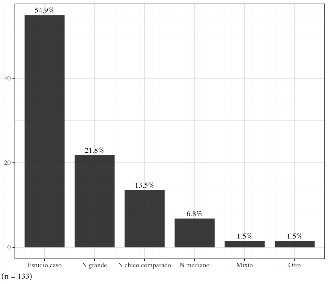 También se observa una disminución de los artículos que se basan únicamente en revisión de literatura y fuentes secundarias para sus análisis. En la estructura de los artículos encontramos que mientras en los primeros años del periodo analizado en profundidad (2010-2022), era común encontrar artículos que no especifican su metodología, en años más recientes hacerlo se ha convertido en la norma, y pasó a ser más común que aparezca una sección específica dedicada a explicitar el método de investigación usado.