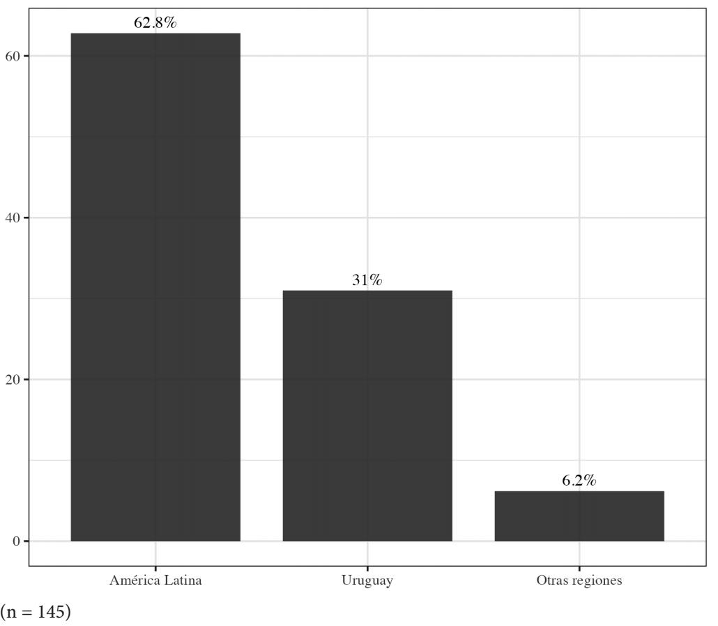 Otro cambio en relación a periodos anteriores es la disminución del foco en el caso uruguayo. Entre 2010-2022 aumentan notablemente los artículos que analizan otros países de América Latina -en particular, Argentina, Brasil, México, y Chile, pero no únicamente- y que realizan estudios comparados que pueden o no incluir al caso uruguayo. Este viraje puede tener que ver con cambios sustantivos en las orientaciones de la disciplina -como el avance de la política comparada- o con el aumento de autores con afiliación institucional externa a Uruguay. También observamos que numerosos estudios de N grande se concentran en observar fenómenos intra-país, aunque muchos enfocados en lo que sucede en Uruguay. Los trabajos de N mediano, en su mayoría abordan América Latina.