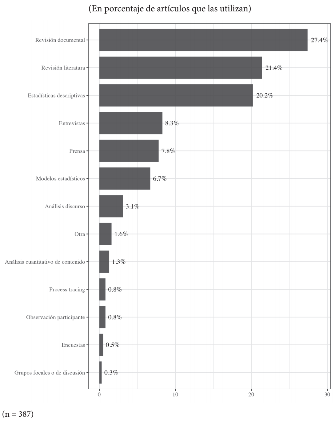 Finalmente, se explora la frecuencia con la que los artículos empíricos emplean diversas técnicas de recopilación y análisis de datos. La revisión documental es la fuente principal, utilizada en estudios de diversa índole y con fines variados, desde la construcción de bases de datos cuantitativos hasta análisis cualitativos del discurso; 8 % de los artículos se basa en entrevistas cualitativas realizadas en trabajo de campo realizado por los investigadores, y 8 % se apoya en la revisión de prensa. En cambio, la observación participante, los grupos de discusión y las encuestas son técnicas infrecuentes. El uso de estadísticas descriptivas se consolida -aparece en 20 % de los artículos- al tiempo que aumenta el uso de modelos estadísticos más sofisticados en comparación con periodos previos, sin llegar a ser los más frecuentes (7 %).
