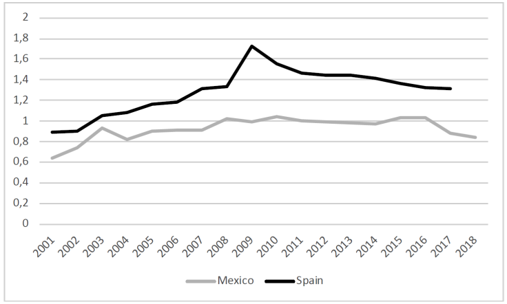 El primer objetivo se plantea contextualizar la situación española y compararla con la mexicana, para poder posteriormente interpretar mejor los resultados vinculados a los tres objetivos siguientes, que son la parte fundamental de la investigación. La Figura 1 nos muestra que el gasto público en las familias es superior en todo el periodo analizado en España, coincidiendo el pico de gasto en este país (cerca de 1.8 % del PIB) con el inicio de la última crisis económica (2008-2014). La cifra en México se mantiene alrededor de 1 % el PIB entre 2008 y 2016, bajando ligeramente en los últimos años del periodo.