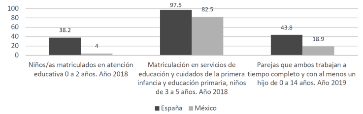 Las diferencias entre ambos países son relevantes también cuando se observa el número de menores en centros escolares, tanto de los que tienen menos de dos años como de los que tienen entre 3 y 5. En ambos casos, la cifra española es superior a la mexicana, pero entre los más pequeños el porcentaje es casi diez veces superior. Por último, el número de parejas en que ambos cónyuges trabajan a tiempo completo cuando tienen menores de hasta 14 años es más del doble en España, lo que se relaciona, entre otros factores, con la mayor disponibilidad de plazas para matricular a los menores en edad preescolar.