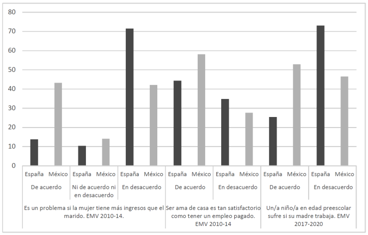Las políticas públicas -ya sea a través del gasto en familias, o de la disponibilidad de plazas escolares- tienen, sin duda, un impacto en el empleo de las madres con hijos de corta edad, y en el reparto de los cuidados entre ambos progenitores; también es importante tener en cuenta los contextos normativos para entender las pautas sociales. En este sentido, la Figura 3 pone de manifiesto que los roles de género tradicionales están más arraigados en México que en España: la población mexicana ve más problemático que la española que la esposa gane más dinero que el marido, son mayoría quienes piensan que ser ama de casa es tan satisfactorio como trabajar de manera remunerada, así como también lo son quienes creen que los menores sufren cuando las madres trabajan (al contrario que la población española, donde esta opinión es minoritaria).