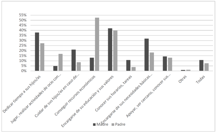 Se seleccionaron todos los casos y las variables del fichero del estudio. Habrá que tener en cuenta que los datos que se muestran están ponderados. Para una primera aproximación a la variable dependiente de esta investigación, se han utilizado las preguntas que recogen información sobre las actividades que la persona entrevistada cree que la sociedad vincula hoy en día principalmente a la imagen del padre y de la madre tanto en primer como segundo lugar (preguntas 15_1, 15_2, 16_1 y 16_2). Las categorías de respuesta incluidas en el cuestionario eran ocho, además de “Otras” y “Todas”: (1) Dedicar tiempo a sus hijos/as; (2) Jugar, realizar actividades de ocio con sus hijos/as; (3) Cuidar de sus hijos/as en caso de enfermedad; (4) Conseguir recursos económicos; (5) Encargarse de su educación y sus valores; /6) Conocer sus horarios, tareas; (7) Encargarse de sus necesidades básicas (higiene, comida, etc.); (8) Apoyar, ser cercano, conocer sus inquietudes, amigos. Estas dos preguntas han sido recodificadas en dos indicadores que suman todas las alternativas de respuesta originales del cuestionario que han sido nombradas tanto en primer como segundo lugar para el padre, como también para la madre (sin las alternativas no sabe o no contesta). Sirva como ejemplo para entender la creación de los indicadores el siguiente: si 15 % de las personas entrevistadas señalan como primera opción que la actividad vinculada socialmente con la figura del padre es dedicar tiempo a sus hijos/as y otras que no lo hicieron en la primera opción pero lo hacen como segunda opción son 10 %; el indicador daría como resultado que 25 % de la ciudadanía señala la dedicación al tiempo a los menores como actividad socialmente vinculada a la imagen del padre.