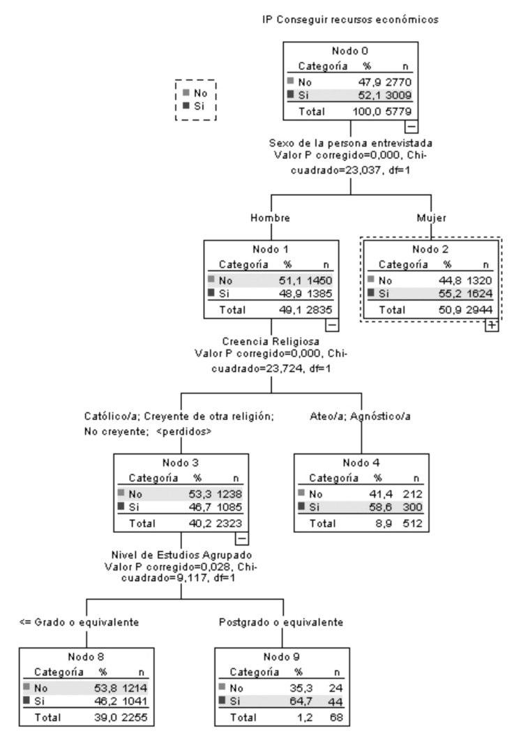 En una segunda división, entran en juego las variables creencia religiosa en el caso del nodo de hombres mientras que en el nodo de mujeres es el nivel de ingresos personales netos. En los hombres que se consideran agnósticos o ateos el porcentaje que menciona la obtención de recursos como imagen de padre asciende hasta 58.6 % frente al resto que lo menciona por debajo de 47 %. En el caso de las mujeres, el nivel de ingresos forma tres nodos: mujeres con ingresos personales menores a 1 800 € al mes, las que obtienen más de 1 800 € y las que no han querido responder sobre sus ingresos. Estas últimas, son las que en menor medida (47 %) asocian socialmente conseguir recursos económicos como actividad vinculada con la imagen de padre, mientras que las que tienen mayores ingresos personales netos, el porcentaje es superior a 70 %.