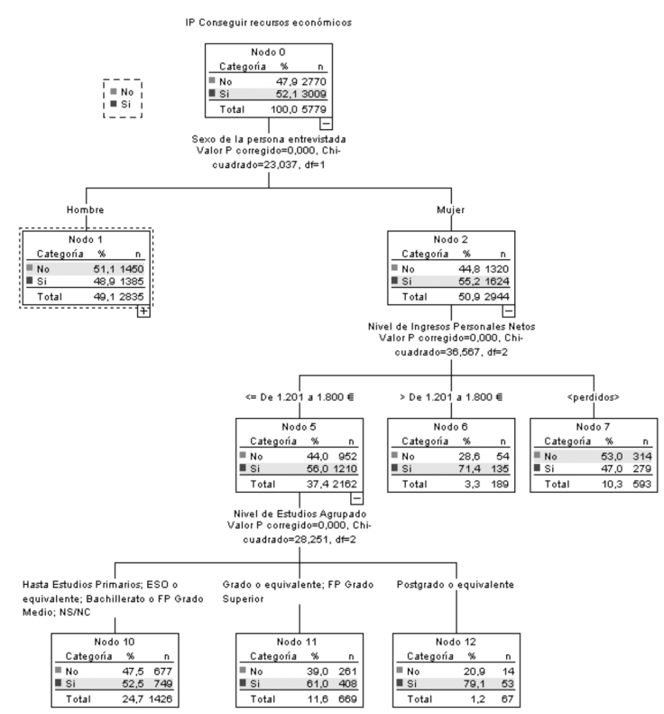 El primer grupo (Nodo 0) contiene todas las respuestas del conjunto de la población encuestada, que asciende a un total de 5 779. De esas respuestas, 52.1 % mencionaron que conseguir recursos económicos es la primera o segunda actividad que la sociedad vincula con la imagen de padre. La variable que ha mostrado mayor poder discriminante en la explicación de seleccionar esta actividad como imagen ligada al padre ha sido la variable sexo de la persona entrevistada, mientras 49 % de los hombres mencionan esta actividad, algo menos de la mitad, lo hacen el más de 55 % de las mujeres, un resultado ya observado en la Tabla 1.