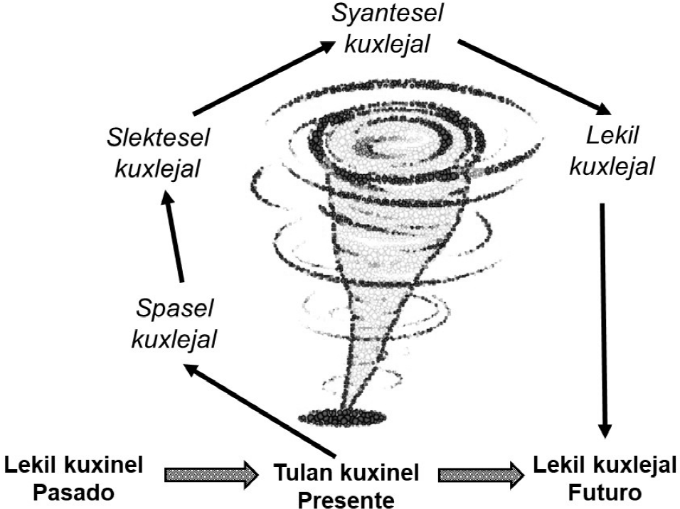 La construcción de estas estrategias conlleva la slektesel kuxlejaltik ‘corrección de nuestra vida’. Así pues, la construcción de la vida no solamente consiste en la reproducción de las prácticas que sirven para el sustento de la familia, sino que implica mejoramiento continuo, incluso se habla del cambio de stalel kuxlejalil ‘cultura’. El buen vivir no se mueve en el sentido lineal, tiene un mejoramiento continuo y sistémico; se integran elementos de la vida pasada, presente y futura; tiene una dinámica ascendente, progresiva y en espiral; es un proceso en el que se introducen nuevos elementos y se expulsan otros, lo que hace posible la vida plena. La metáfora que explica mejor esto es el remolino de forma espiral y ascendente, como se ilustra en la Figura 1.