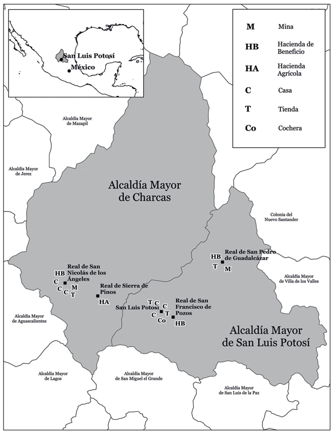 Mapa 1 PROPIEDADES INMUEBLES DE JOSEFA GERTRUDIS NIETO TÉLLEZ-GIRÓN EN LAS ALCALDÍAS MAYORES DE SAN LUIS POTOSÍ Y CHARCAS