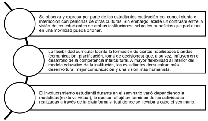 En ese sentido, la implementación de estrategias e intervenciones apoyadas por recursos virtuales, que estén enfocadas a promover el entendimiento y conocimiento sobre otras culturas, resulta de gran utilidad, pues permite no solamente responder a la actual necesidad de una educación bajo un enfoque flexible, sino también bajo una visión inclusiva, permitiendo poder beneficiar a un mayor número de estudiantes de los que pudieran experimentar una experiencia de movilidad física. La Figura 3 presenta de forma resumida a los hallazgos preliminares que han surgido a raíz del pilotaje del seminario