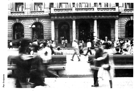 Con su cuaderno en la mano, el yo poético se pregunta “¿Para qué escribo?” (Lihn 1983: s. p.), en un intento de registrar que es, a la vez, un intento de atrapar la contingencia del paseo y la intervención de los mendigos allegados, en particular, de El Pingüino. Este último tamborilea en su tambor hechizo de plástico barato de Taiwan, su propia forma de registrar que el yo poético emula, de ahí que toquen “el tambor a cuatro manos” (Lihn 1983: s. p.). Aparece así el Canto General interpretado por el Pingüino: “Canto General al Paseo Ahumada” (Lihn 1983: s. p.) de la “naturaleza muriente de Santiago” (Lihn 1983: s. p.). El otro registro de esa “mendicidad general” (Lihn 1983: s. p.) es lo capturado en la imagen (Fig. 2), pero aquello ya sucedió y ante esa suerte de figuración fantasmática se mira y se siente la fotografía con el anhelo de recuperar algo perdido. La mirada va más allá de la mera captura: va hacia los encuadres, los desenfoques, los puntos de fuga (studium). En mayor medida, va hacia lo que punza y provoca: el punctum barthesiano (Barthes) a través las observaciones/anotaciones que hace el yo poético sobre los sujetos mendigos fantasmales: el Pingüino y su tambor; el caminar fugaz de la muchedumbre; los cuerpos borrosos/fantasmales de sujetos que no se han de identificar, por ejemplo, los detenidos desaparecidos que (des)aparecen en este paisaje degradado como fantasmas de un crimen que la creación del paseo y su ambiciosa puesta de progreso bursátil intenta sepultar en el olvido.