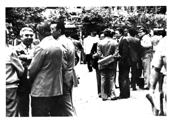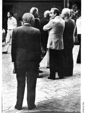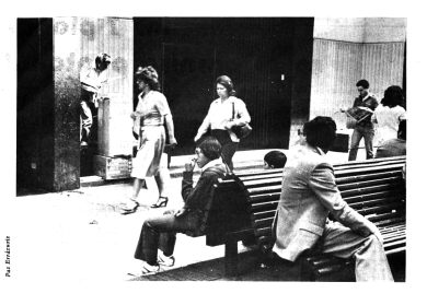 Más adelante en el poemario, aparece el banquero como otro sujeto que comparte “su espacio” con la mendicidad (Figs. 3 y 4), integrándose a instituciones bancarias que forman parte de la representación de la escena moderna instalada en dictadura, con sus ejecutivos vestidos con trajes formales y que portan maletines, que sostienen una grata conversación con sus pares sin llegar a mezclarse con los habitantes menos afortunados del paseo: es la cara más privilegiada del paseo. En las imágenes estos sujetos aparecen retratados, en su mayoría, en posición contraria al objetivo de la cámara, por lo que sólo se capturan sus espaldas. Esta lejanía visual remarca lo expresado en el poemario, pues es una clara oposición hacia el mendigo. Si bien el sujeto banquero aparece sólo en dos imágenes, en el poemario su presencia es omnipresente, pues representa el control y la vigilancia de la corrección de todo lo que sucede y de lo que no sucede en la arteria.