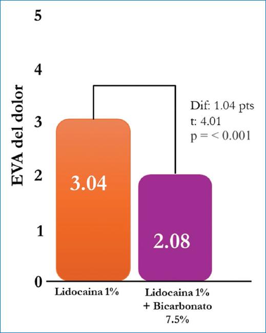 En el estudio realizado por Stewart et al.5 se demuestra que la alcalinización de los anestésicos locales reduce el dolor al momento de aplicarlos. Se encontró que la adición de 100 mEq/l de bicarbonato de sodio a una solución de lidocaína al 1%, con o sin epinefrina, neutraliza el pH ácido y atenúa el dolor cuando se inyecta en las extremidades superiores.