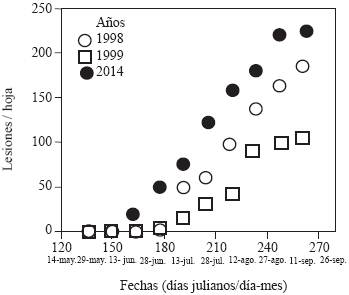 The dynamics of lesions/leaf throughout the plating cycle in the three orchards in the corresponding years are presented in Figure 1. The lesions are round chlorotic spots with an oily appearance and a diameter of 3 to 6 mm that turn silvery and then light brown. In all three orchards, defoliation after mid September was over 90 %. The lesions always appeared on the leaves in late June and over 100 lesions/leaf were counted towards mid-September (Table 1). When adjusting the data of Figure 1 to the epidemiological models, it turned out that for the epidemic of 1998, 1999, and 2014, the best-adjusted models were Logistic Ln, Gompertz, and Logistic Ln, respectively (Table 2).