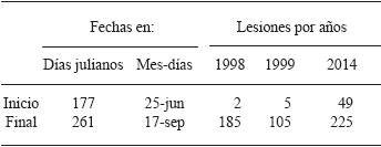 Table 1 Starting dates of the first lesions/leaf caused by M. caryigena, and final date in which more than 100 lesions/leaf are reached in different years.