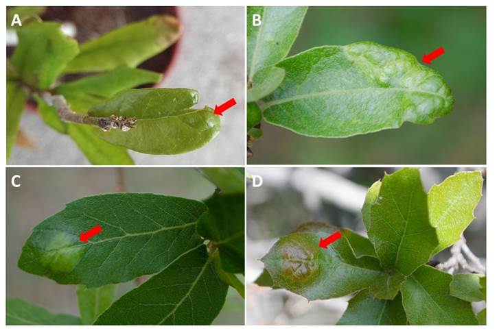 Although budding was observed on the surface of Q. potosina after 48 h post inoculation no secondary blastospores were observed there was also no formation of germ tubes. Disease symptoms developed only on the leaves on Q. eduardii in 30% of the plant that were inoculated after one month (Figures 3 A-D), these results are similar to Taylor and Birdwell (2000).