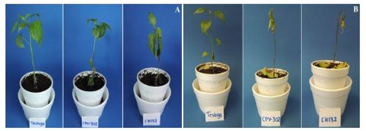 Figure 2 Pathogenicity tests of Phytophthora strains: Control, CPV302 and CH132 (from left to right) in habanero chili pepper seedlings. Symptoms nine dai (A). Symptoms 16 dai (B).