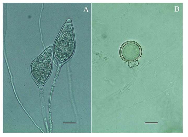 Figure 3 Morphological characteristics of isolation CH132. A: Papillated sporangia (≥3.5 μm), ovoid and obpyriform with a long pedicel (>20 μm). B: Spherical and plerotic oospore, smooth oogonium wall and amphigynous antheridium. Bars 20 μm.