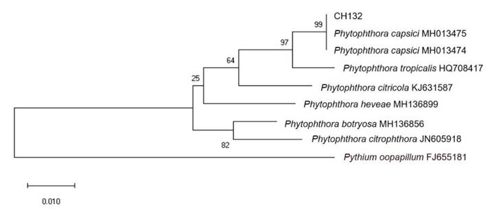 Molecular characterization. The DNA amplification of isolation CH132 by PCR with oligonucleotides COIF-1 and COIR-1 created a 727 pb PCR product. The sizes of the PCR products are similar to those reported by Choi et al. (2015) with the use of COI. The BLAST analysis helped determine that isolation CH132 has a similarity of 100% with the species of P. capsici (Accession numbers AY129166, MH136864, MH013474, MH013475 and HQ261267). This was confirmed with the phylogenetic analysis under the criterion of maximum likelihood, which shows the similarity of isolation CH132 with two P. capsici of Capsicun annuum isolations (Figure 4).