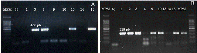 Producto de RT-PCR de un fragmento de 438 pb del segmento L que codifica la replicasa viral de O. impatiensnecromaculae: MPM= Marcador de peso molecular 100 pb PROMEGA, control negativo (-). Carriles 1, 3, 4, 9, 10, 13, 14 y 15 muestras de plantas de haba con síntomas de mosaico, moteado, enrollamiento y marchitamiento. B) Producto de RT-PCR de un fragmento de 319 pb del ORF del P. phaseoluteum que codifica para la nucleocápside: MPM= Marcador de peso molecular 100 pb PROMEGA, control negativo (-). Carriles 1, 2, 3, 4, 9, 10, 13, 14 y 15 plantas de haba con síntomas de mosaico, moteado, enrollamiento y marchitamiento. Las secuencias de los amplicones obtenidos tuvieron un 99% de cobertura y 99 % de identidad con aislados de P. phaseoluteum y O. impatiensnecromaculae depositados en el GenBank, respectivamente.