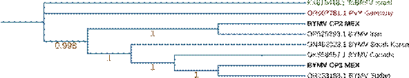 Los aislados CP1MEX y CP2MEX de BYMV encontrados en haba en esta investigación, se agrupan con aislados de Sudán e Irán, respectivamente, pero no entre ellos mismos (Figura 2).