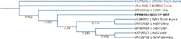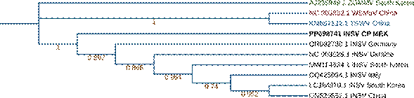 Figura 4 Árbol filogenético del segmento S correspondiente a la nucleocápside del aislado INSV CP MEX del Orthotospovirus impatiensnecronmaculae utilizando el modelo Jones Taylor Thornton Model y el método de máxima verosimilitud con 500 repeticiones de bootstrap.