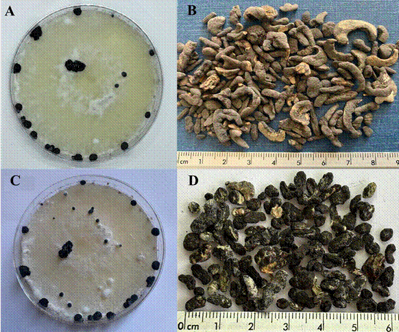 Figura 1 Crecimiento micelial y esclerocios de Sclerotinia sclerotiorum. A). Crecimiento del hongo obtenida de frijol y esclerocios en doble círculo en caja de Petri con PDA; B). Esclerocios de color café claro producidos en plantas de frijol en campo; C). Crecimiento del hongo obtenido de planta de papa con esclerocios dispersos en caja de Petri con PDA; D). Esclerocios color negro producidos en plantas de papa en campo.