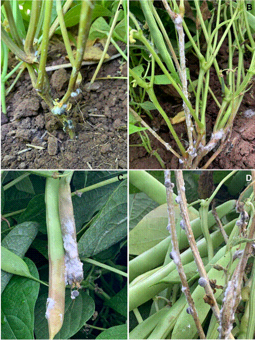 de la enfermedad en la base del tallo de las plantas (Figura 2 A), por lo que es probable que la infección inicial ocurra mediante la germinación directa de los esclerocios (miceliogénica); de ahí, el síntoma avanza a tallos, foliolos y vainas (Figura 2 B y 2 C) donde se forma micelio algodonoso y blanquecino causando una pudrición suave, donde inicia la formación de esclerocios (Figura 2 D). Esta observación coincide con trabajos previos donde los esclerocios germinan produciendo micelio que causa infección en las plantas (Abawi y Grogan, 1979; Lane et al., 2019).