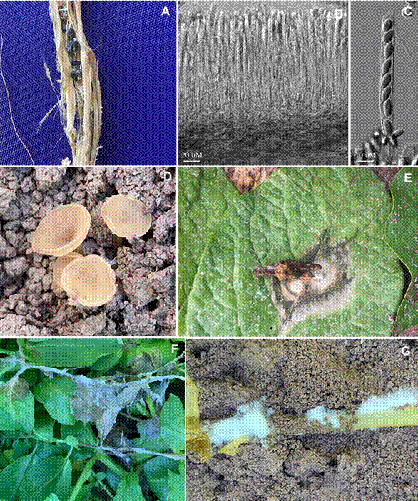 En papa, se han observado esclerocios en el interior de los tallos (Figura 3A) así como apotecios del hongo en la superficie del suelo (Figura 3D) con ascas (Figura 3B) y ocho ascosporas en su interior (Figura 3C); también se han observado inflorescencias infectadas que caen sobre las hojas, y a partir de este punto ocurren los síntomas iniciales de la enfermedad (Figura 3E) la cual avanza e invade el resto de las partes de la planta (Figura 3F). También se han observado tallos sobre el suelo