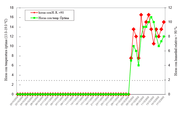 Figura 4 Períodos diarios con temperatura óptima del suelo (2.5 cm de profundidad) para la germinación de esclerocios de S. sclerotiorum y períodos con humedad relativa > 90 % en el norte de Sinaloa del 20 de octubre al 03 de diciembre de 2002.