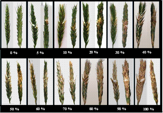 Evaluaciones. Se realizaron cinco evaluaciones de la severidad de la enfermedad de cada tratamiento a los 4, 9, 14, 19 y 26 días después de la inoculación (DDI), utilizando la escala visual del tizón de la espiga de triticale (Figura 1), ajustada a la investigación para evaluar la severidad bajo condiciones de invernadero. Para realizar dicha escala, se tomó como referencia la escala visual para estimar la severidad de Fusarium en la espiga de trigo propuesta por Stack y McMullen (1998). Con base al porcentaje de severidad promedio obtenida, las variedades de triticale se clasificaron en: Resistente (0 a 10), Susceptible (20-40) y Muy Susceptible (41-100).