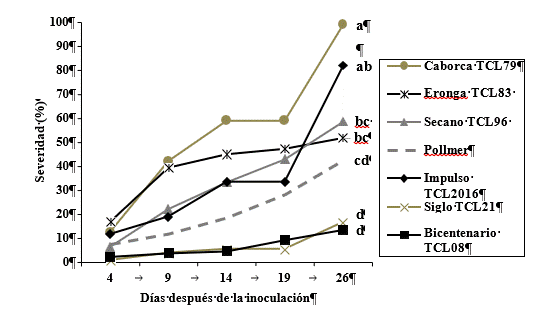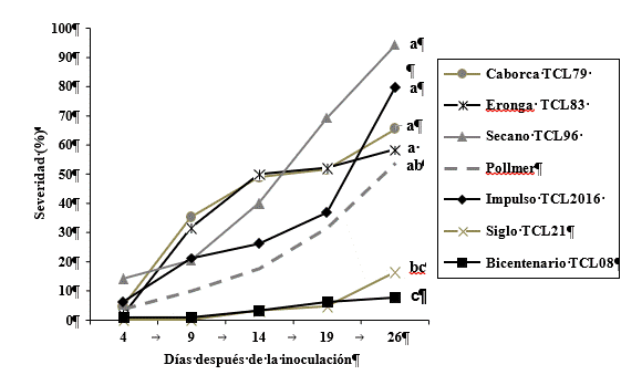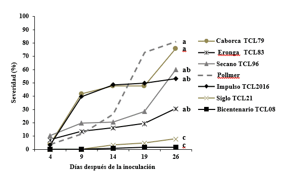 %, con respecto a Secano TCL96, Impulso TCL2016, Caborca TCL79 y Eronga TCL83, siendo estos los que presentaron un mayor desarrollo de la enfermedad.