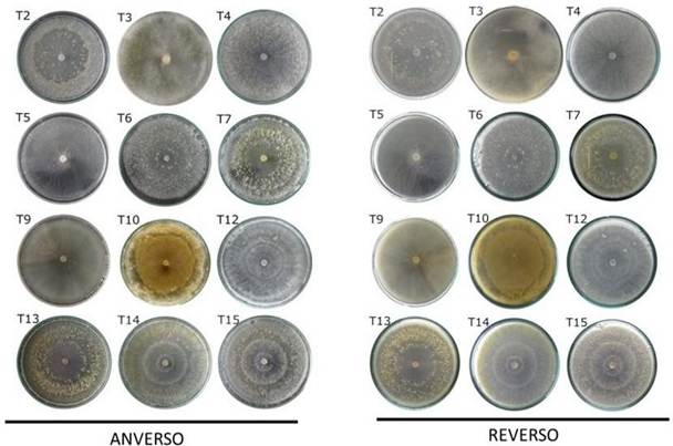 Caracterización macroscópica. Los aislamientos fúngicos seleccionados se reactivaron en PDA; luego de un periodo de incubación (siete días), se utilizaron para describir la morfología colonial externa. Se consideraron características como: textura (algodonoso, plano) y color del micelio (blanco, verde), formación de anillos concéntricos (presencia, ausencia) (Granda-Mora et al., 2020; García-Núñez et al., 2017) y el color al reverso de las colonias (hialino, amarillo, café) (López-Calva et al., 2018).