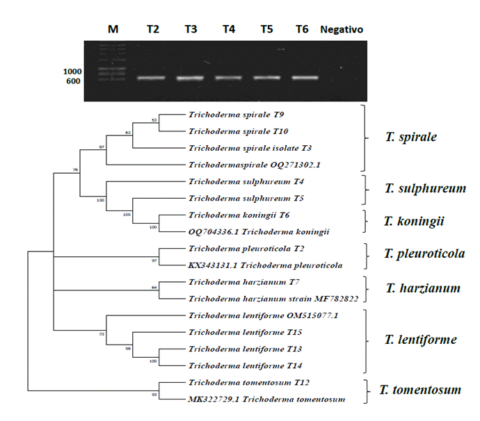 Reconstrucción filogenética. El análisis bioinformático de las secuencias se realizó con el software MEGA11 (Tamura et al., 2021) y se alinearon mediante el algoritmo de agrupación W. Las secuencias obtenidas se compararon con secuencias de otras especies de Trichoderma incluidas en el GenBank utilizando la herramienta básica de búsqueda BLAST (http://www.ncbi.nlm.nih.gov/BLAST), y las secuencias con mayor similitud se utilizaron para asignar la identificación de especie a cada cepa aislada. El árbol filogenético se ensambló empleando el método Bootstrap (1000 repeticiones), con secuencias obtenidas del GenBank y secuencias de identificación molecular referenciadas en el GeneBank de la base de datos del National Center Biotechnology Information (NCBI).