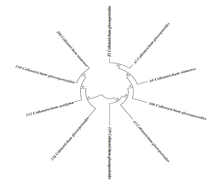 La caracterización molecular mostró que los tres aislamientos de Colletotrichum corresponden a diferentes especies: C. gloeosporioides (Z1), C. siamense (108) y C. aenigma (112) (Figura 4). Dos (C. gloeosporioides y C. siamense) de estas tres especies identificadas en el presente estudio fueron previamente reportadas en el cultivo de café arábico como patógenas y afectando hojas y/o frutos (Cristobal-Martínez et al., 2016) en México; así como en Asia (Damm et al., 2012) y Brasil (Prihastuti et al., 2009). Mientras que C. aenigma, especie agrupada dentro del complejo C. gloeosporioides, no ha sido reportada en el cultivo de café arábico, por lo que podría considerarse el primer reporte de esta especie; sin embargo, debido a la complejidad para la identificación de especies de Colletotrichum, consideramos necesario realizar la caracterización molecular con el uso de secuencias multilocus adicionales a ITS (Cristobal-Martínez et al., 2016; Zhu et al., 2023) para aseverar la identificación de esta especie.