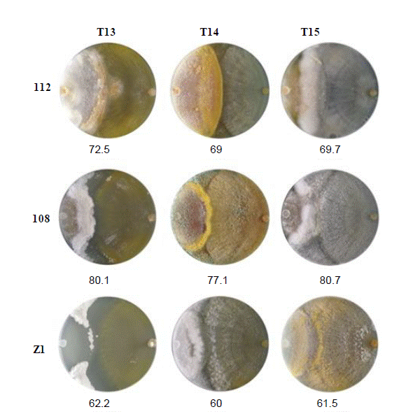 Pruebas de antagonismo. La inhibición del crecimiento micelial de Colletotrichum sp., se observó en su mayoría al cuarto día de incubación; corroborando el rápido crecimiento de Trichoderma y su potencial para inhibir el crecimiento micelial del fitopatógeno (Fernández y Suárez, 2009). El mayor porcentaje de inhibición del crecimiento miceliar de C. siamense (108) se observó al interaccionar con el aislamiento T15 de Trichoderma (Tukey, 0.05). En la interacción de las cepas de Trichoderma (T13, T14 y T15) con los aislamientos de C. gloeosporioides (Z1), C. siamense (108) y C. aenigma (112), se observó un cambio de color del medio de cultivo en la zona de interacción de los micelios de ambos microorganismos. Posteriormente las cepas de Trichoderma crecieron sobre el micelio de Colletotrichum; esta respuesta es un primer indicativo de su potencial como microorganismos hiperparásitos (Hernández-Mendoza et al., 2011).