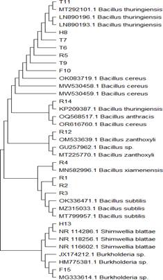 identificaron como B. subtilis R1 (PV583383), R2 (PV583384), R3 (PV583385); y uno como B. xiamenensis R4 (PV583386); Bacillus thuringiensis T11 (PV583393), R14 (PV583396); B. zanthoxyli R12 (PV583394); Shimwellia blattae H13 (PV583395), y Burkholderia tropica F15 (PV583397). Los bioensayos de actividad promotora de crecimiento vegetal in vitro mostraron que B. cereus, B. subtilis, y B. thuringiensis, presentaron capacidad de producir sideróforos, solubilizar fosforo y actividad de quitinasa (Cuadro 1).