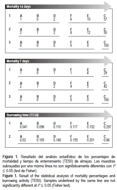 El ensayo subletal finalizó tras 48 h. El número de organismos enterrados en cada uno de los replicados se contabilizó tras 15, 30 y 45 min, y 1, 1.5, 3, 6, 12, 24 y 48 h del inicio de la exposición. Para el cálculo del tiempo estimado en el que se han enterrado 50% de las almejas (TE50) se usó una modificación del análisis Logit. Tras 7 y 14 días se contabilizó el número de organismos vivos mediante el tamizado del sedimento (0.5 mm) y se calculó el porcentaje de mortalidad.
