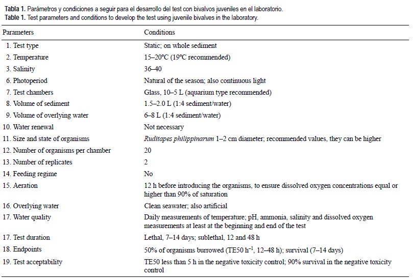 Las condiciones y los parámetros para el desarrollo del ensayo se presentan en la tabla 1. Los sedimentos se añadieron a las cámaras de exposición hasta obtener una profundidad de al menos 5 cm, añadiendo agua de mar en relación 1:3, y se airearon al menos 12 h previamente a la introducción de los organismos. El día de inicio del bioensayo se seleccionaron entre 20 y 40 organismos que fueron introducidos a cada uno de los replicados sucesivamente.
