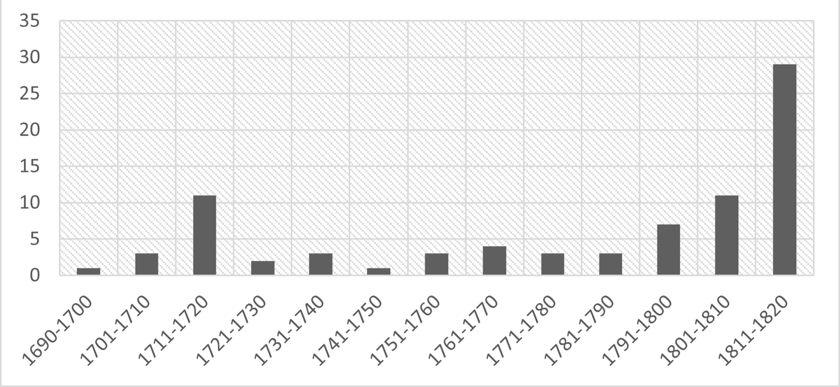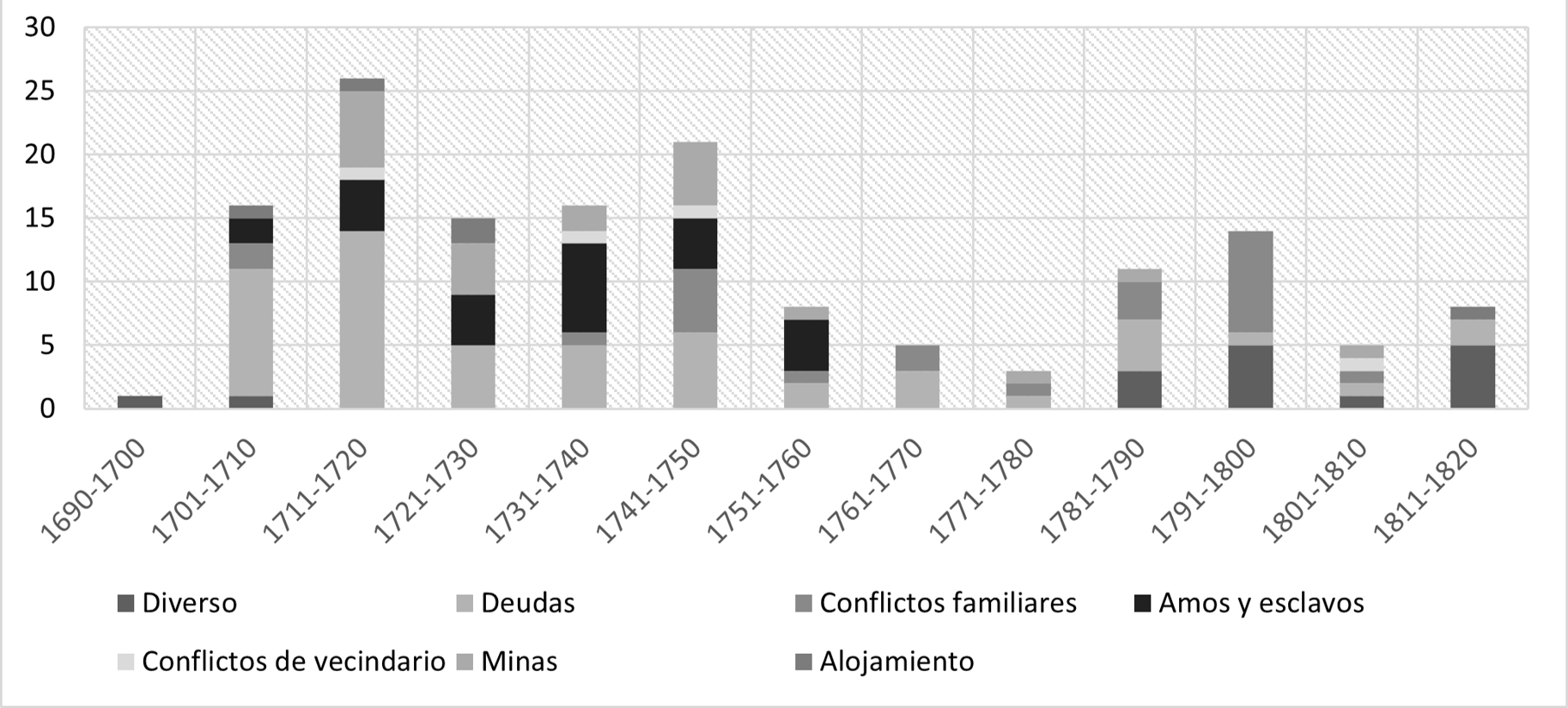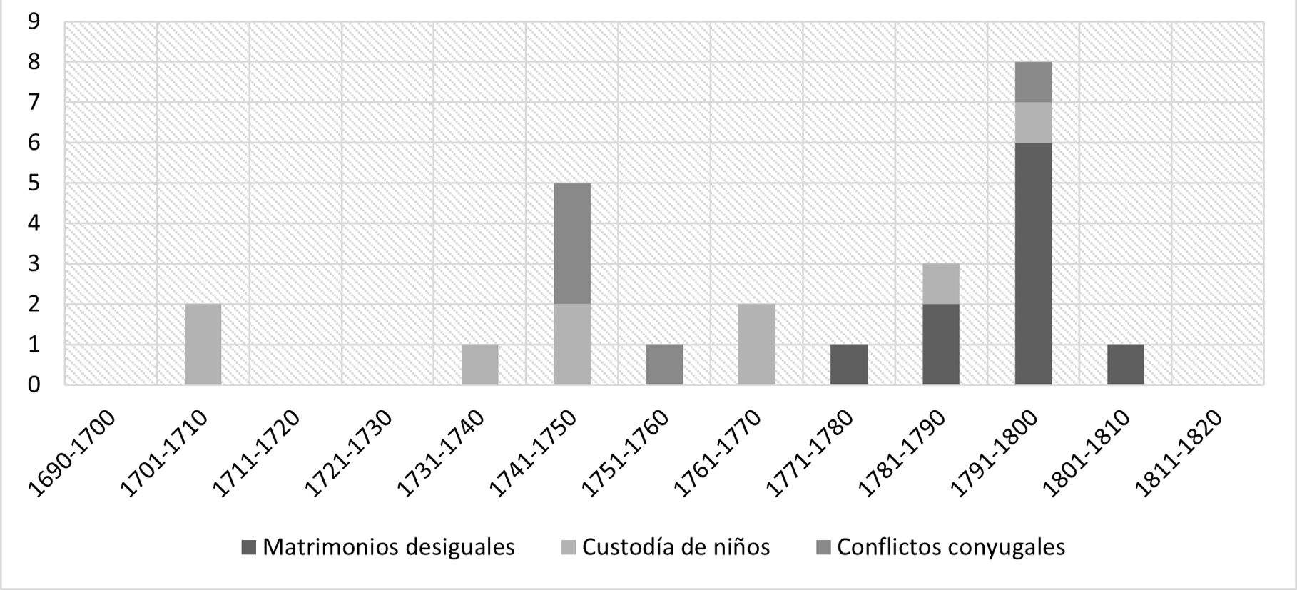 En primer lugar, el volumen de los pleitos es mucho más reducido: entre 0 y 8 pleitos cada año. Además, la evolución cronológica es diferente en la medida que la mayoría de los casos ocurrió durante la segunda mitad del siglo XVIII. La evolución cronológica se nota igualmente en el origen de los conflictos. Los pleitos causados por asuntos de matrimonios desiguales aparecieron de manera lógica a partir de la Real Pragmática de 1776 y se convirtieron en el principal motivo de conflicto a finales del periodo. Hasta este momento, los pleitos más comunes eran provocados por los conflictos conyugales y la custodia de niños. Así, podemos destacar dos periodos. Hasta los años 1770 vemos a una población social y económicamente frágil, pero capaz de movilizar la justicia para defender sus intereses y los de sus niños. Al contrario, a partir de los años 1770, las castas -sobre todo los afrodescendientes- aparecieron como una población que padecía más y más de la crispación social y del proceso de racialización del periodo, hasta en los aspectos más íntimos de su existencia (Mörner, 1974).