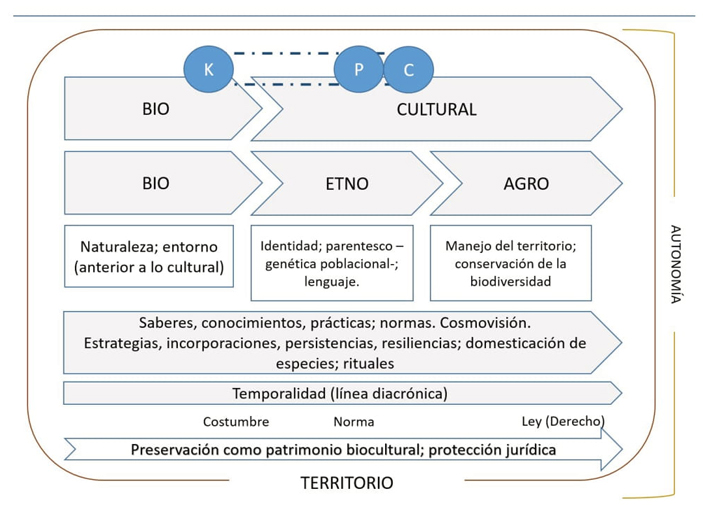 Como se esquematiza en la figura 1, si desglosamos las dimensiones de lo biocultural en dos componentes -lo bio y lo cultural- basándonos en una línea diacrónica, veremos que lo biológico antecede a lo cultural, si bien al tiempo se dio (y se sigue dando) una coevolución. Al desglosar ambos componentes, lo «bio» comprende la primera relación naturaleza-hombre manifestada en la cosmovisión. Integramos la triada k-c-p19 de Víctor Toledo para sustentar la imbricación de las dimensiones de lo biocultural en el tiempo y sus manifestaciones como parte de la cultura que deben preservarse tanto como patrimonio como legalmente.
