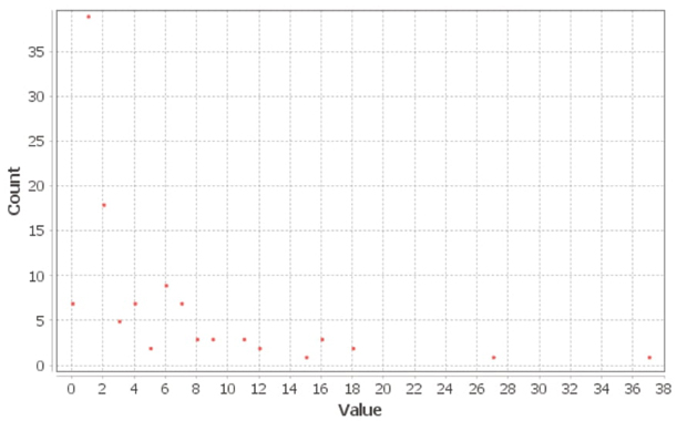 El índice de centralización por grado obtenido en la red mediante R Studio fue de 0.34 (34 %), nivel de centralización bajo, indicando por tanto la existencia de una red pluricéntrica que presenta una estructura cimentada entre varios actores. Por otra parte, la distribución de grados en la red (véase Fig. 3) indica a pocos actores con muchos vínculos y muchos actores con pocos vínculos (una gran mayoría entre uno y dos vínculos).