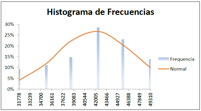 De acuerdo con datos de la Bolsa Mexicana de Valores, el IPC reportó una media µ de 42 206.06 puntos, con una desviación estándar de 5 151.24 en el lapso 2010-2018 (Tabla 7). Se observó una baja volatilidad del Índice bursátil, con un coeficiente de variación de 12.2% respecto a la media. En este sentido, hubo menor el riesgo por unidad del rendimiento. Una asimetría de -0.4 y un coeficiente de curtosis de -0.6, siendo estas negativas y menor a la unidad. Ello representó una distribución menos apuntada (platicúrtica), con colas más gruesas.