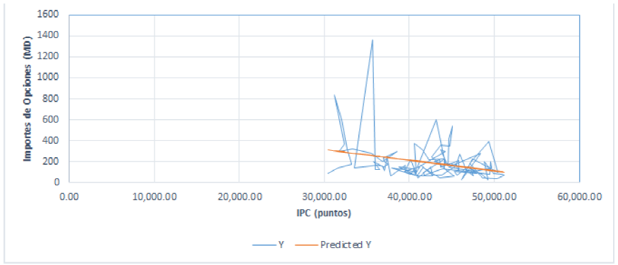 De este modo, los importes de los contratos advierten de una percepción de los inversionistas, a que sí hay una tendencia a que a medida que crece el IPC, los importes de los contratos registran una baja importante (Figura 2). Existe una relación negativa o inversa entre los importes de las opciones y el IPC. Ello se atribuye a que la percepción de riesgo y rentabilidad, se pone en juego al subir el IPC; lo que impulsa a los operadores a mover sus estrategias.