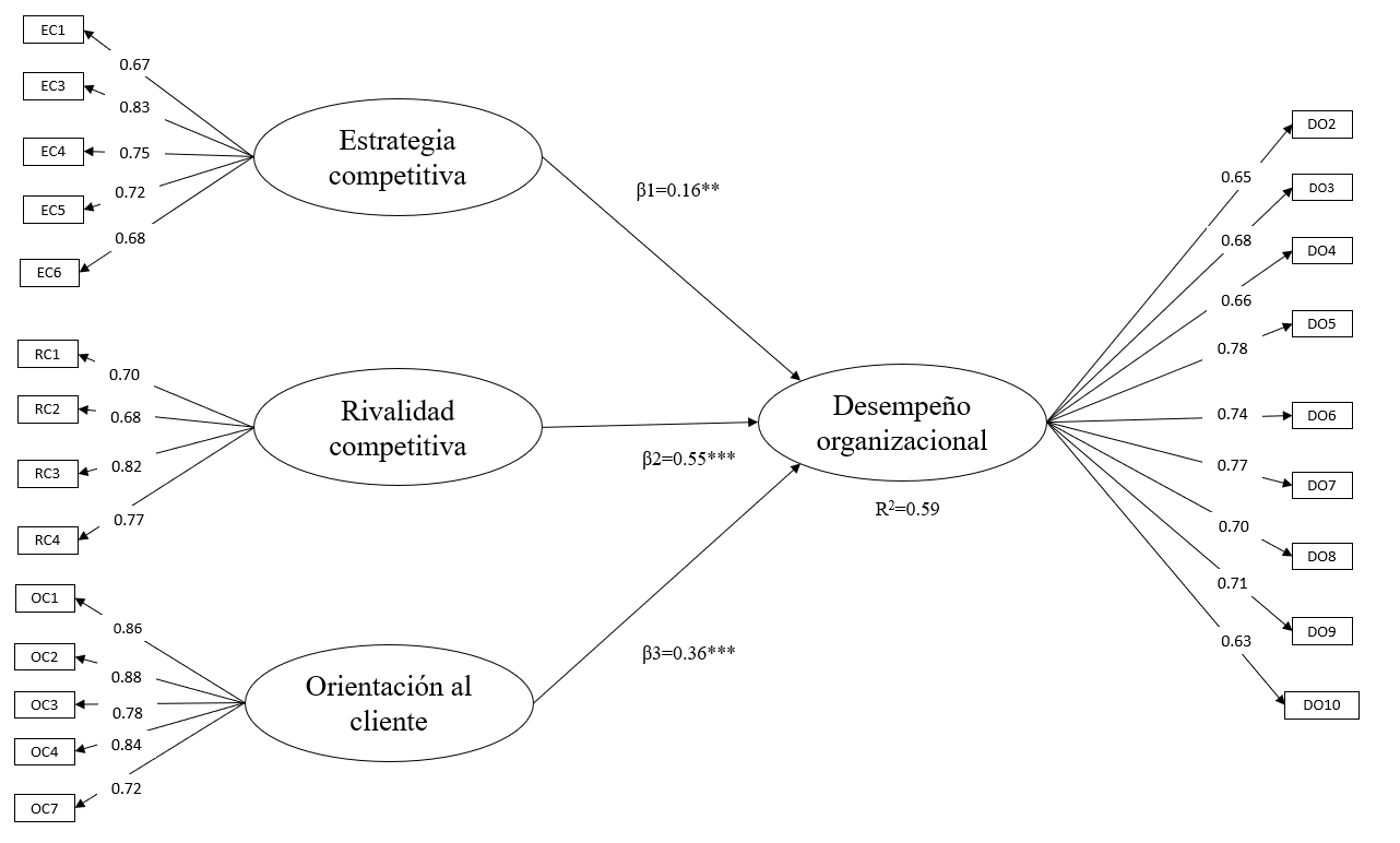 | Rivalidad competitiva | Desempeño org. | 0.55 | 0.07 | 6.48*** | H2: Validada |