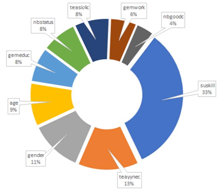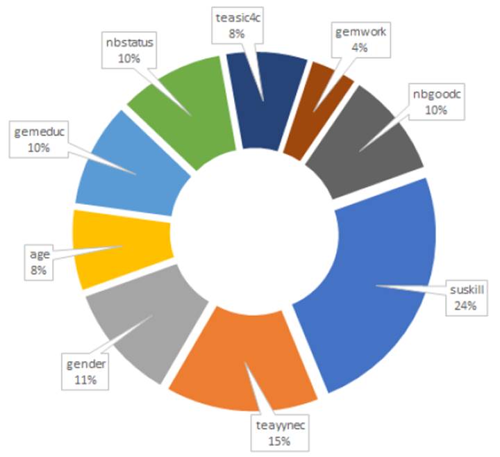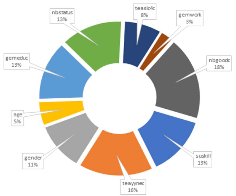En la Figura 2 se muestra la participación de las variables estadísticamente significativas para los países Latinoamericanos y miembros de la OCDE, durante el periodo 2001-2016. En este segundo grupo de países se detectó que la variable suskill también es un criterio importante (con un 24% relativo) para explicar a la variable fearfail, mientras que la variable nbgoodc sigue siendo una variable poco relevante (con un 10% relativo) para explicar a la variable dependiente fearfail. Los resultados de la Figura 1 y Figura 2 permiten afirmar que la distribución de las variables estadísticamente significativas es considerablemente homogénea en los dos grupos de países. Es decir, no se aprecian diferencias sustanciales en la distribución de frecuencias para las variables estadísticamente significativas en los dos grupos de países. Los resultados más significativos para estos dos grupos de variables es que la variable nbgoodc (En mi país, la mayoría de la gente considera que iniciar un nuevo negocio es una opción de carrera deseable) tuvo una importancia del 8.3% para los países del primer mundo, mientras que dicha participación fue del 37.5% para los países Latinoamericanos. De la misma manera, la variable teayynec (Participa por necesidad en la actividad empresarial) registró una importancia del 29.2% para los países del primer grupo, mientras que esta participación fue del 54.2% para los países Latinoamericanos.