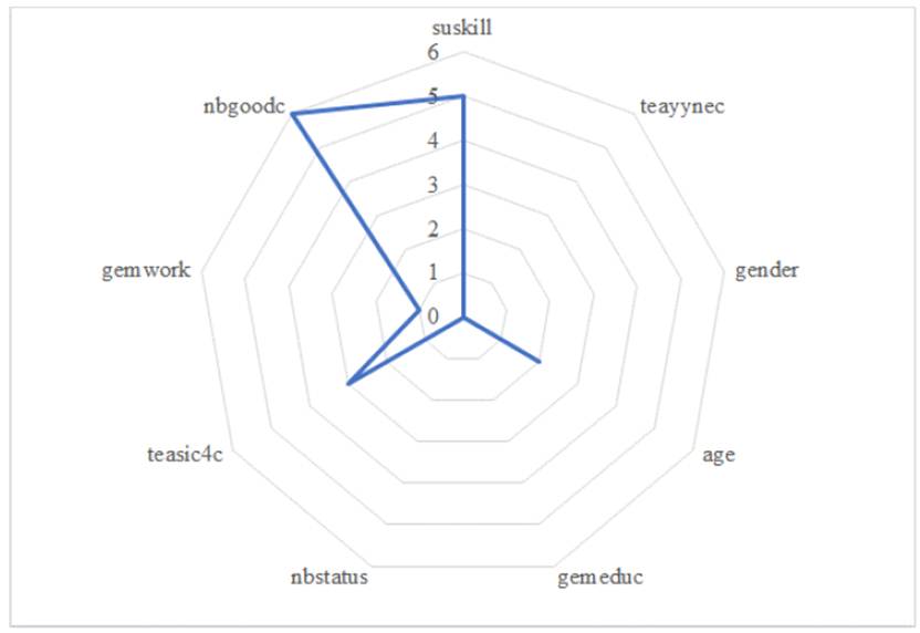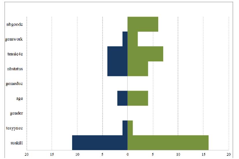 Este mismo análisis se puede apreciar para las otras variables estadísticamente significativas, donde la variable gemwork (Situación laboral) presentó la menor distancia (1 unidad, que representó el 3% del vector de distancias) entre ambos grupos de países de la OCDE. En otras palabras, la situación laboral tiene la misma importancia, en los dos grupos de países de la OCDE, para explicar el miedo al fracaso de emprender un nuevo negocio, aunque la importancia de esta variable no trascendió a niveles extraordinarios en cada grupo de países de la OCDE (12.5% de importancia -6% del total de frecuencias de las variables estadísticamente significativas- para los países desarrollados y 16.7% de importancia -4% del total de frecuencias de las variables estadísticamente significativas- para los países Latinoamericanos.